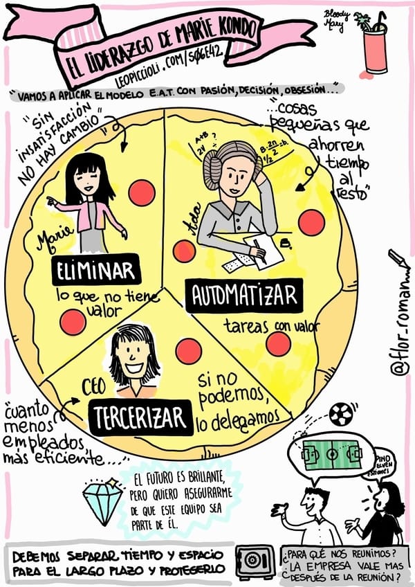 -Eliminar, automatizar, tercerizar, una y otra vez. Primero, seremos Marie Kondo. Levantamos una máquina de fax, si sentimos cariño o valor, la apoyamos de nuevo. Si no, la tiramos a la basura. Cuando lo hagamos con la gente, tenemos que cuidarlos, hacerlo con empatía. Primero lo hice con ustedes, por eso siguen aquí. Tomamos un proceso. ¿No tiene valor? Lo eliminamos. Esta reunión, ¿tiene valor?